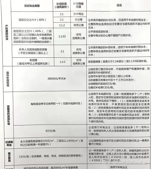 04、各村集体物业,按1:1补偿办公楼,如果择住宅或商务公寓,则和物业公司私宅补偿标准一致。
