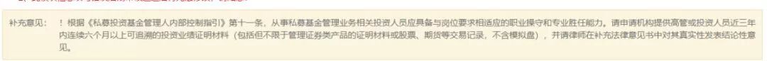 根据《私募投资基金管理人内部控制指引》第十一条,从事私募基金管理业务相关工作人员应具备与岗位要求相适应的职业操守和专业胜任能力。申请机构需提供高管或投资人员股权(含创投)项目成功退出证明(包括但不限于管理产品的证明材料、退出材料等)或者三年及以上在申请机构拟投资行业的从业经验证明材料(包括但不限于在职证明、工作经历情况说明等),并请律师在补充法律意见书中对其真实性发布结论性意见。